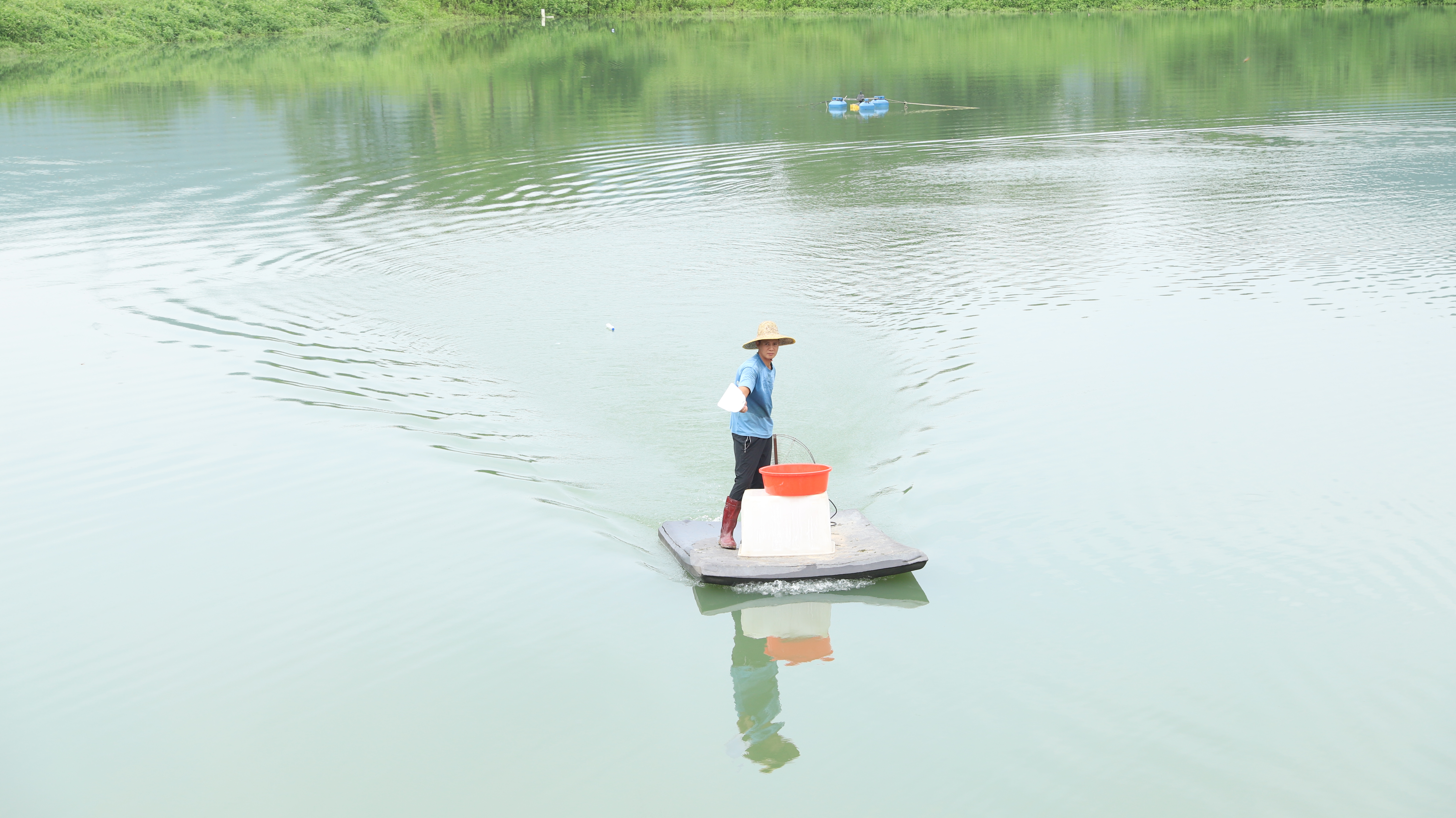 養(yǎng)殖員在水塘給蝦喂食。惠州日?qǐng)?bào)記者鐘暢新 攝