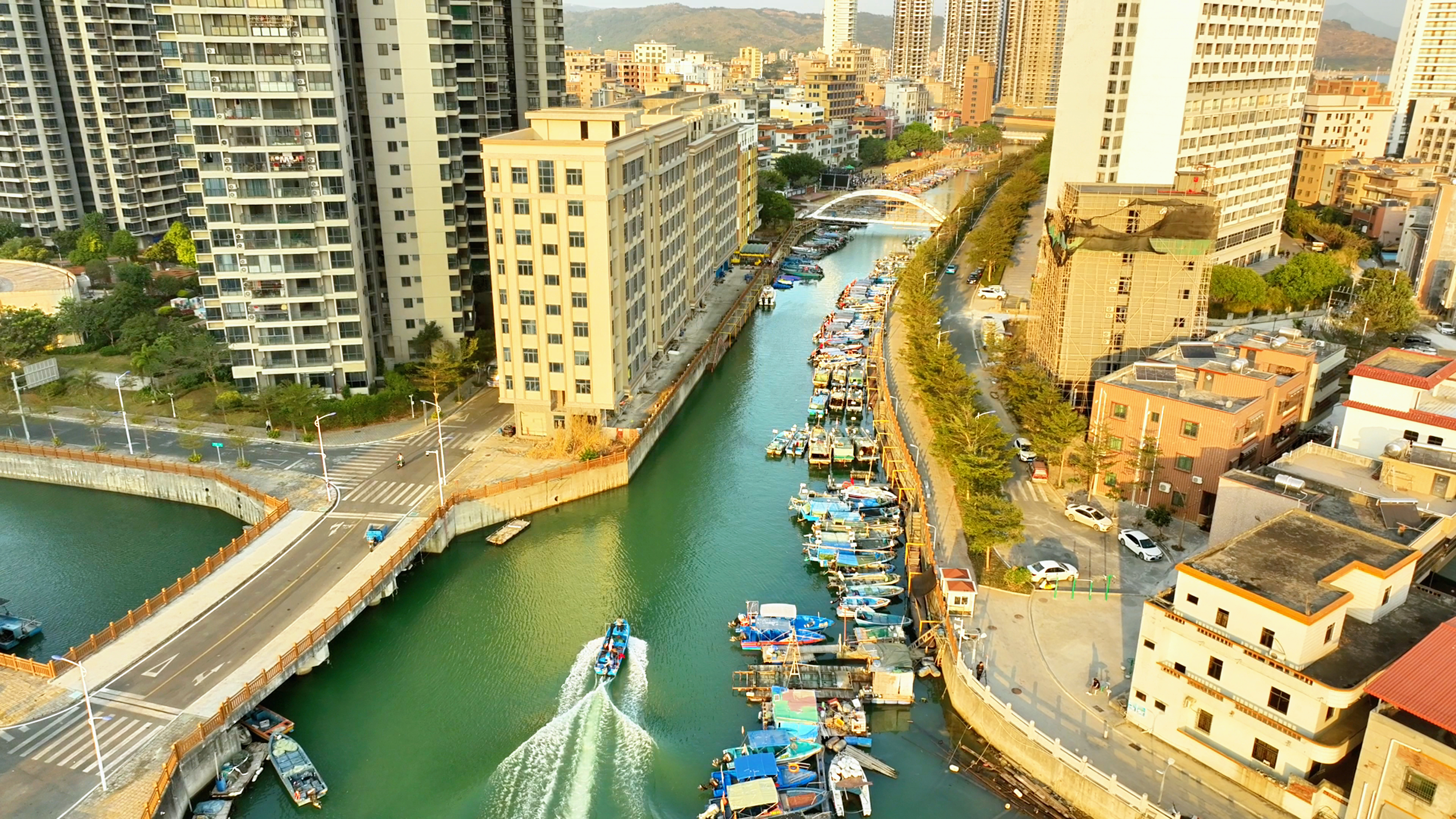 在霞涌,彎曲如龍的青龍河從鐵爐嶂的山澗盤旋而出,自北向南一路奔流,流經(jīng)新村村和霞新村等村莊后,在連心橋下的包禾塘入海。傍晚,一艘艘休閑漁船在岸邊整齊排列,三五成群的白鷺棲息在船篷上。一艘快艇從大海歸來進入包禾塘,船艇推開水面順著河流直上,驚起白鷺翩飛,留下一串泛著金光的扇形波紋。