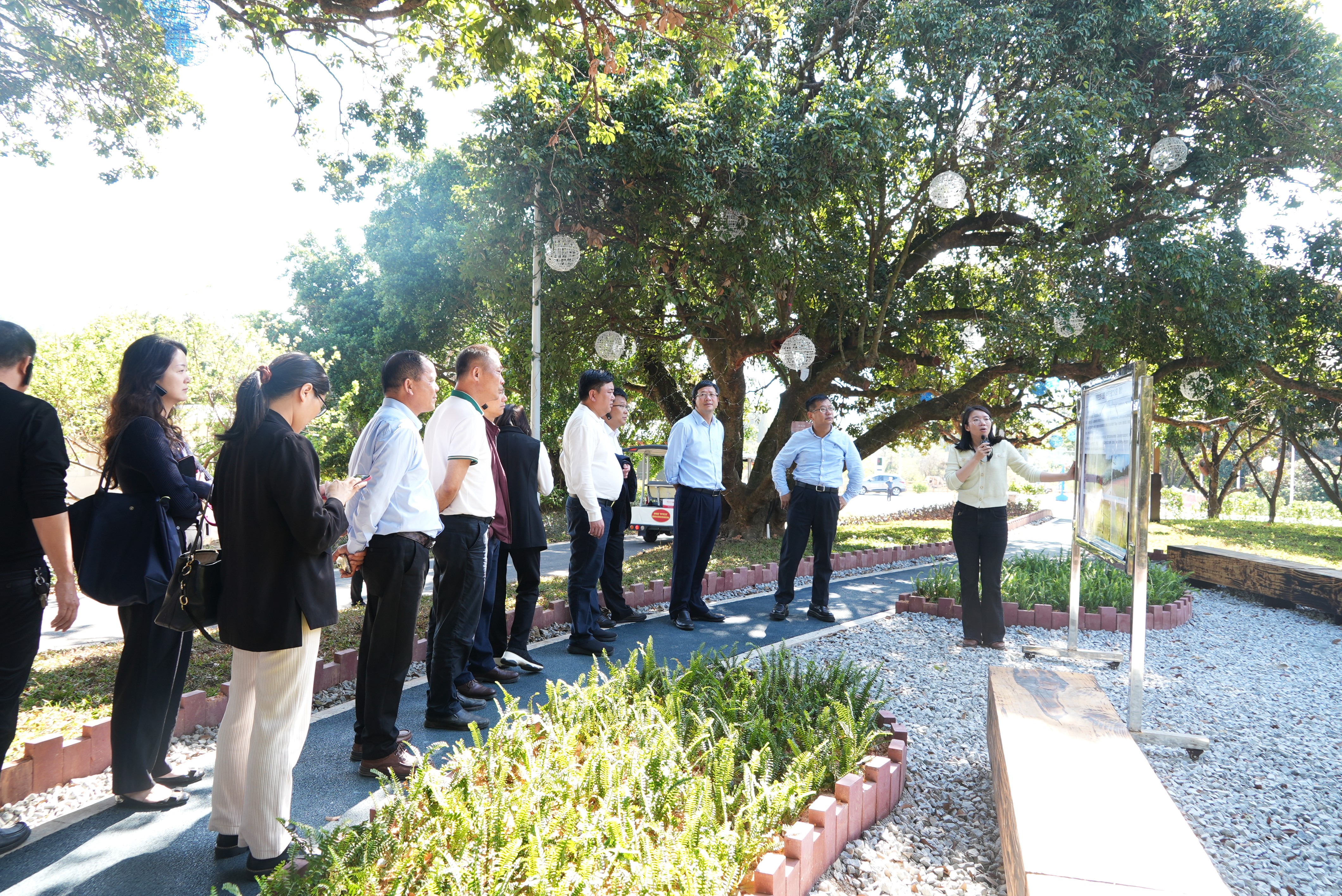 “這個(gè)位于白盆珠鎮(zhèn)白盆珠社區(qū)雙下村小組的中蘇友誼文化園,是我們因地制宜建設(shè)的綠美生態(tài)小公園,將建于1959年的蘇聯(lián)專家樓和有34棵百年老樹的濱江古樹公園聯(lián)動起來,并修建了景觀廣場、球場、休閑步道等,成為周邊群眾都愛來的休閑游玩好去處!卑着柚殒(zhèn)黨委副書記廖素芳詳細(xì)介紹白盆珠鎮(zhèn)培育省“百千萬工程”典型鎮(zhèn)的經(jīng)驗(yàn),并不時(shí)回答大家的疑問,現(xiàn)場交流氣氛熱烈。