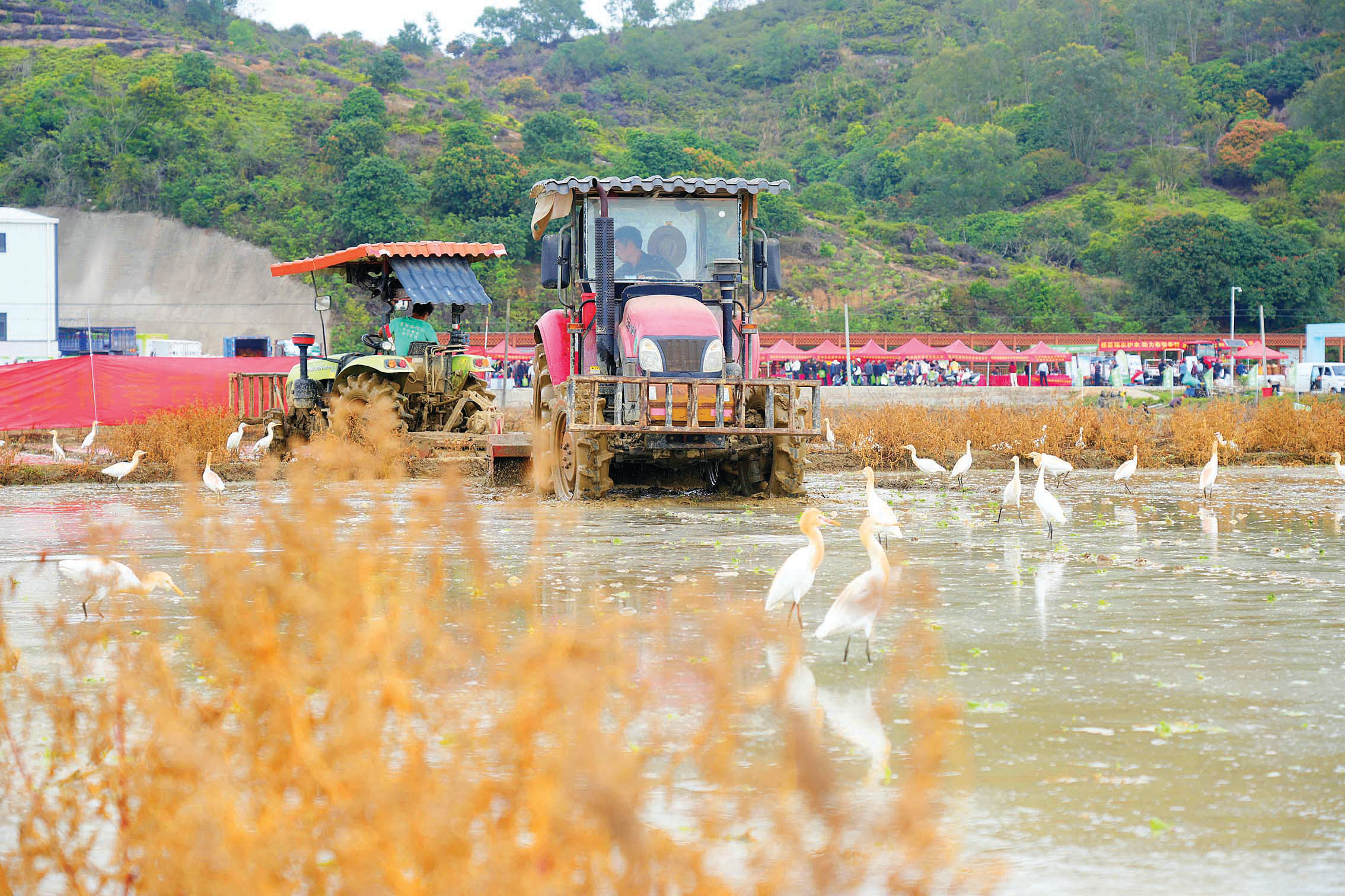 農機手駕駛新型農機忙著打田,一群白鷺圍著覓食。