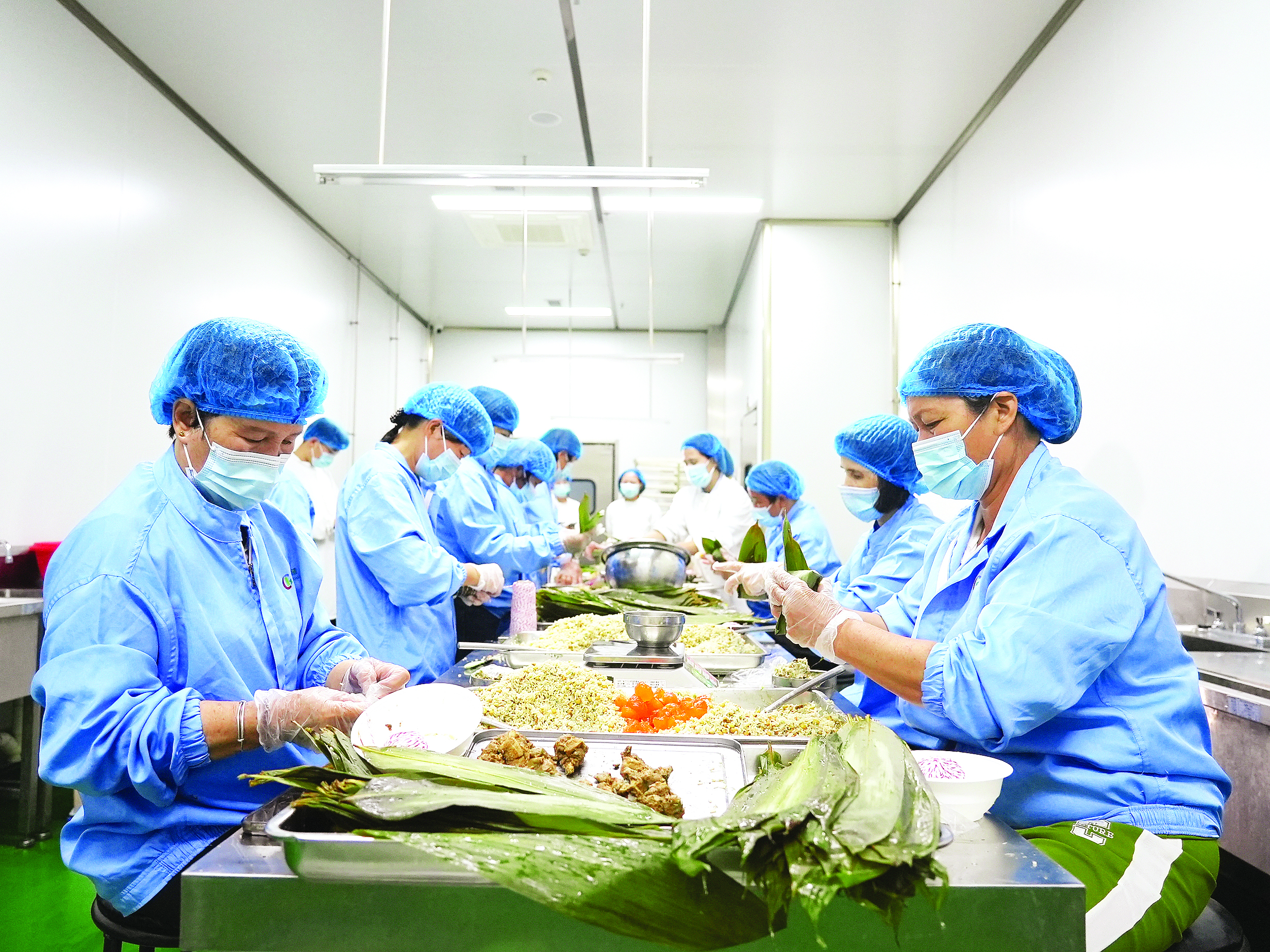 國惠膳生產(chǎn)車間內(nèi),工人在制作預(yù)制菜產(chǎn)品。