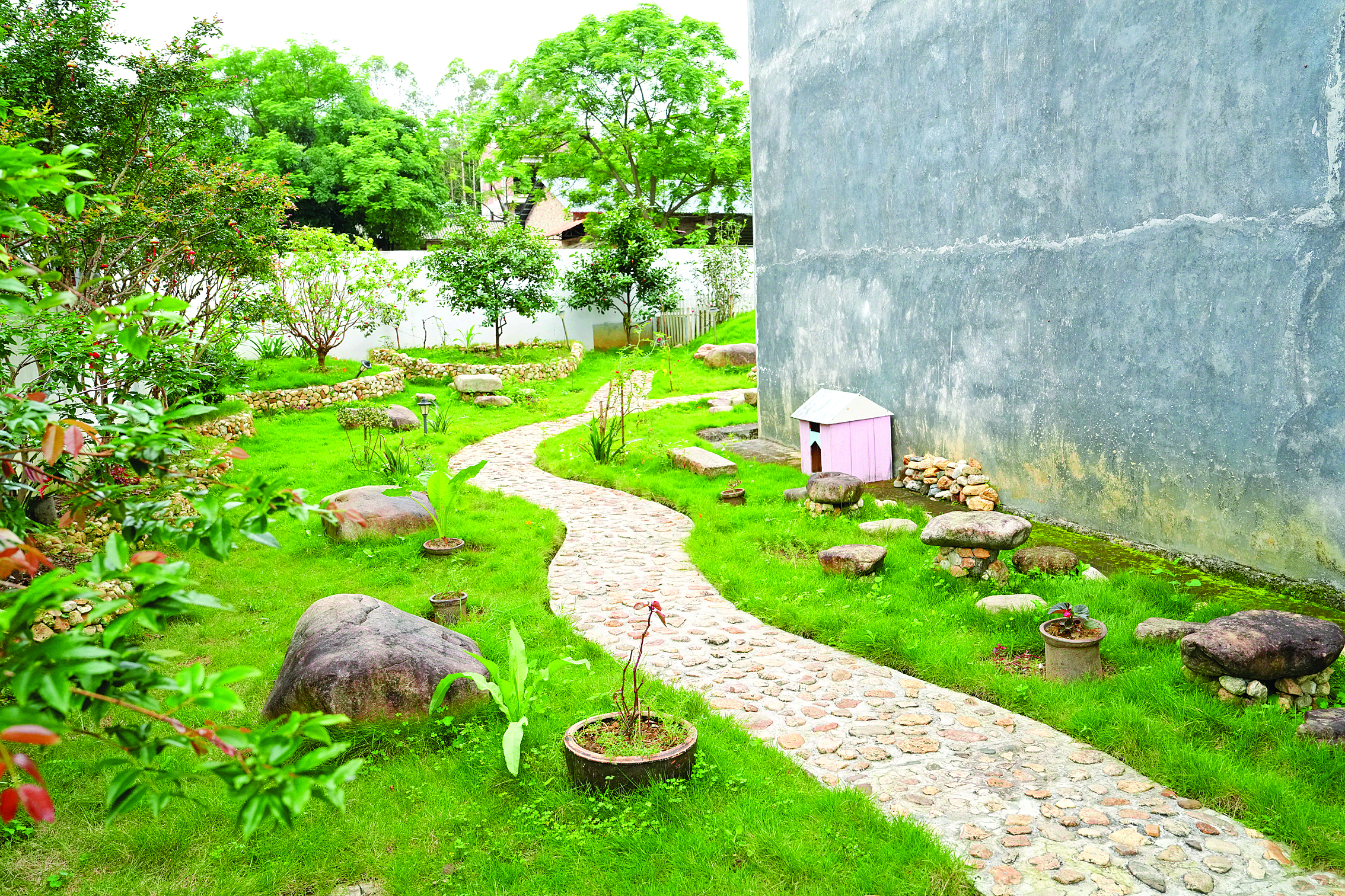 在龍?zhí)镦?zhèn)另一戶村民鐘志星家里,庭院里栽有各類花草,院子里的花壇、小徑、涼亭裝飾物等都用天然鵝卵石人工砌成,與花草灌木相映成趣,甚是好看!拔蚁矚g花草園藝,平時(shí)對(duì)園林設(shè)計(jì)也有所了解。前兩年長(zhǎng)期待在家,有時(shí)間打理一下院子,我也是樂在其中!辩娭拘歉嬖V記者,庭院內(nèi)的每一處都是他一點(diǎn)一滴堆砌起來(lái)的。不僅是自家院子,鐘志星家門口的空地也在他和家人精心打造下,變身成為村里“口袋公園”,為大家提供了賞綠、享綠的好去處。