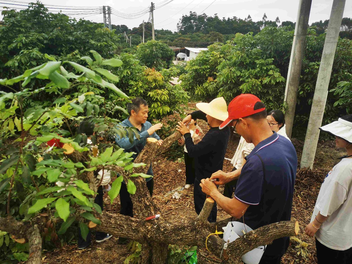 專家和農(nóng)技人員到村里指導(dǎo)龍眼新產(chǎn)品改良嫁接。