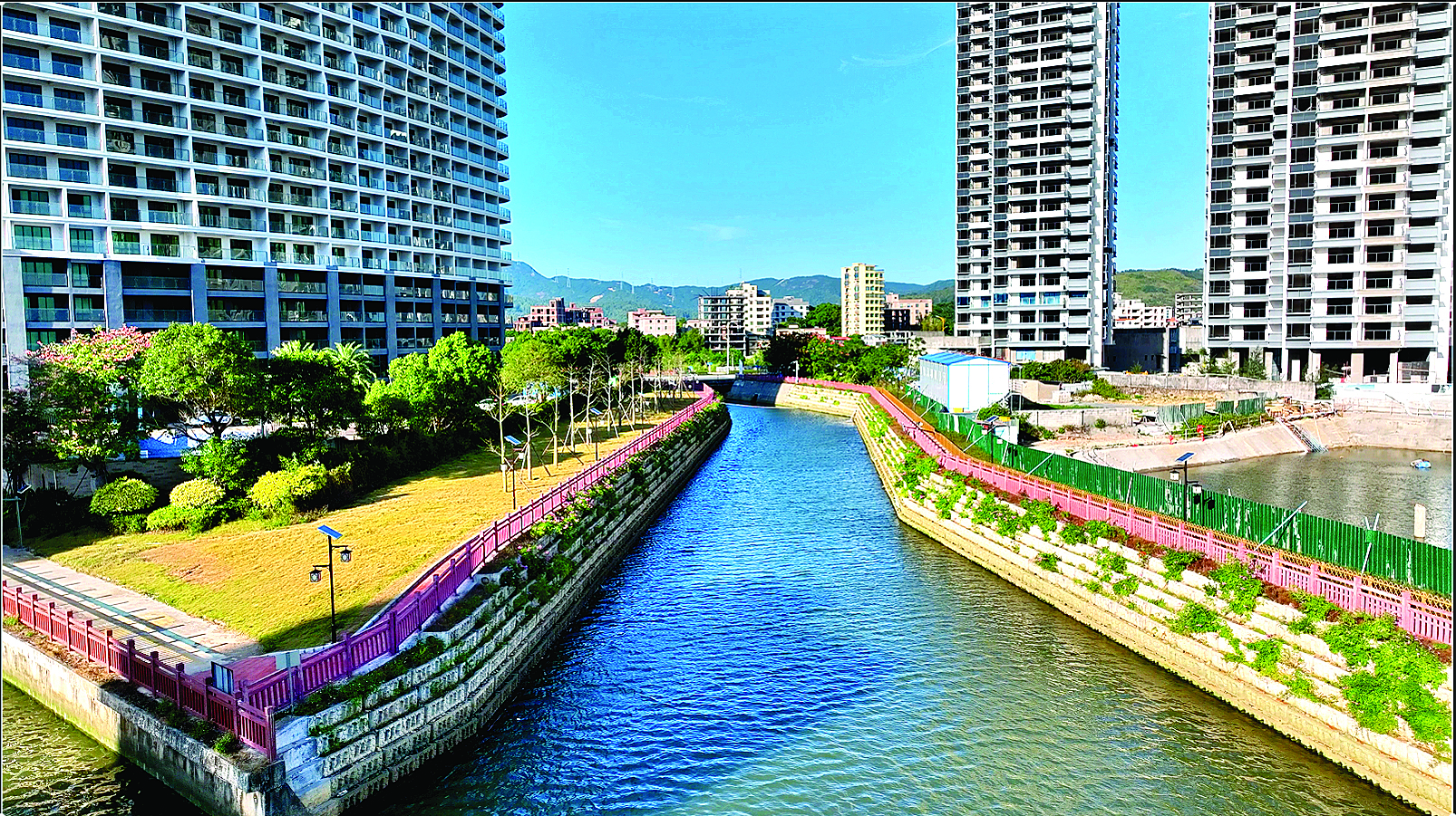 清風(fēng)徐來(lái),水波不興,河面上倒映著藍(lán)天白云和兩岸的美景,沿著嶄新的人行道漫步,心曠神怡。