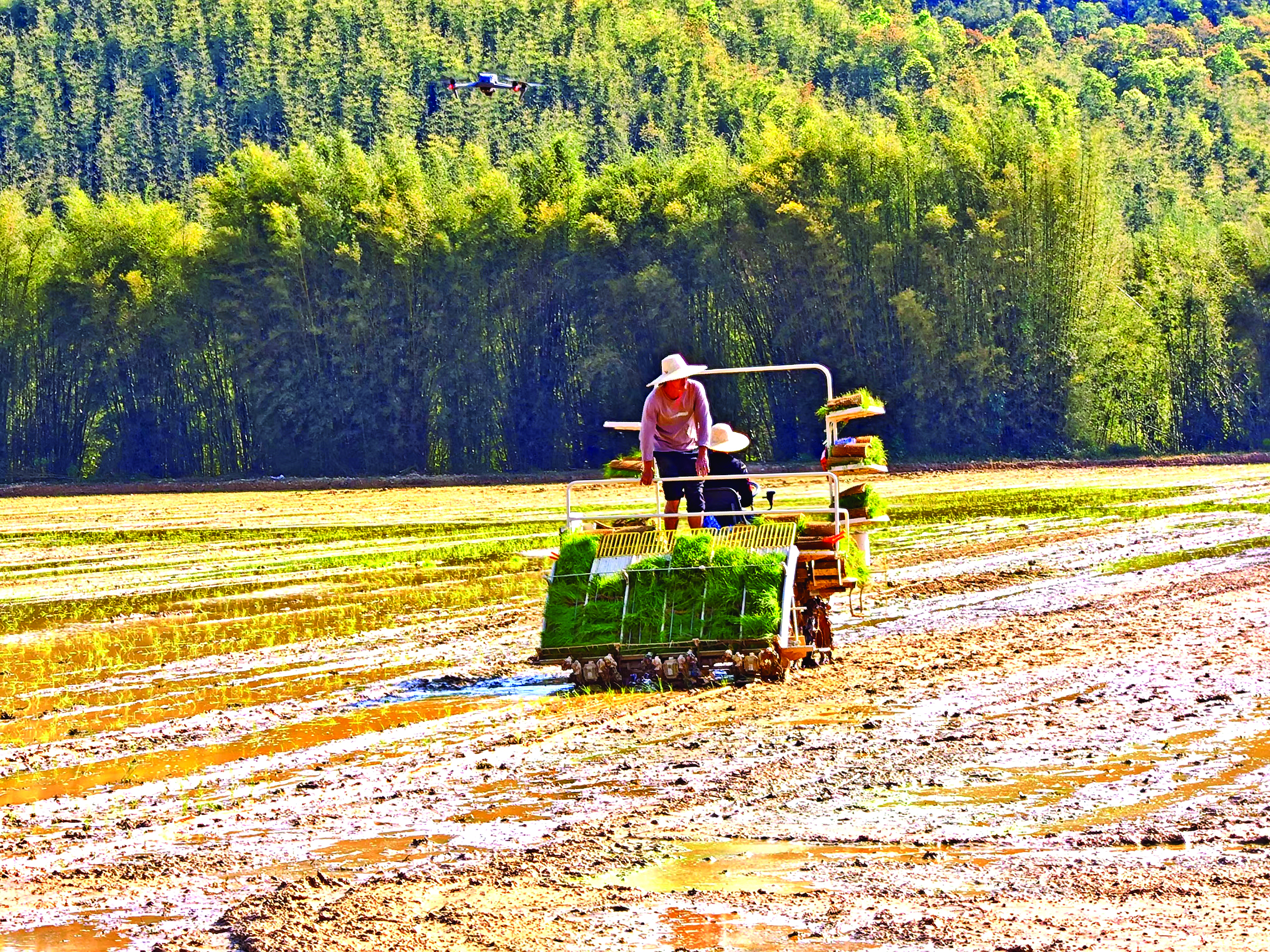 在蘆洲鎮(zhèn)嵐星村標準農(nóng)田里,機械轟鳴,三臺翻地機正編隊作業(yè)翻耕土地。插秧機在田間演示,一株株玄脂米秧苗隨機械臂擺動快速植入泥中。無人機銀翼旋轉(zhuǎn),將微量元素肥料均勻播撒。據(jù)了解,嵐星村今年春種玄脂米50畝。