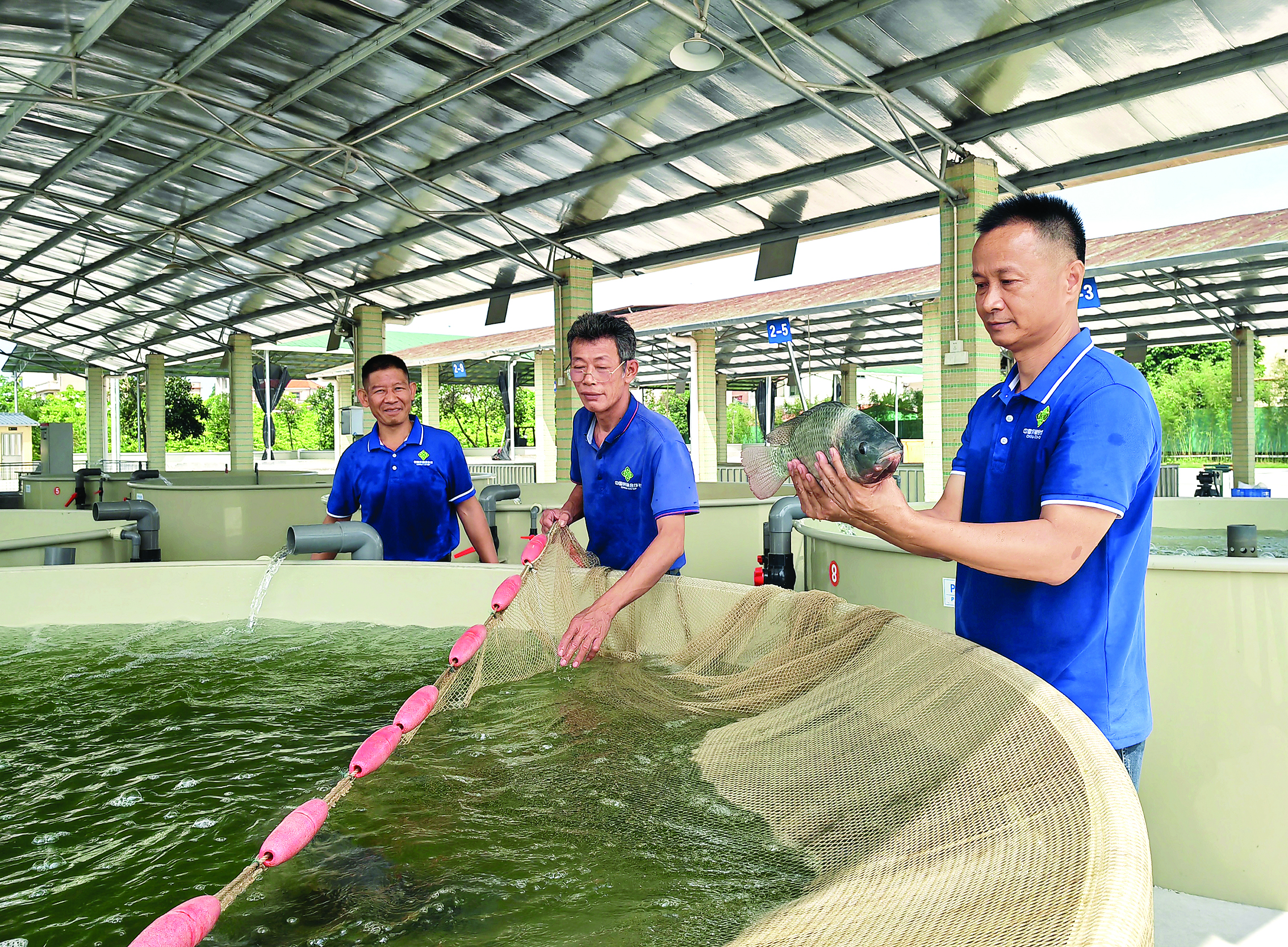 工作人員在養(yǎng)殖池前查看魚兒“瘦身”效果。 惠州日報記者劉建威 攝