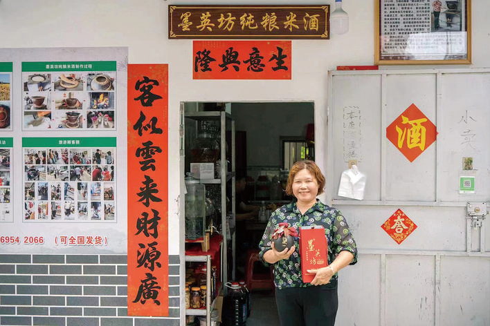 墨英酒坊的經(jīng)營者叫廖龍英,人稱英姐,憑著祖上傳下來的釀酒技術,加上個人的喜好、鉆研,她以手工釀制的方式,釀成擁有獨特風味的“墨英酒”。多年來,英姐一方面匠心傳承和發(fā)揚祖?zhèn)麽劸萍妓嚕硪环矫婵炭嚆@研學習,不斷改進工藝,講好新時代“釀酒故事”,讓傳統(tǒng)手工釀酒在文旅融合中迸發(fā)出新活力。