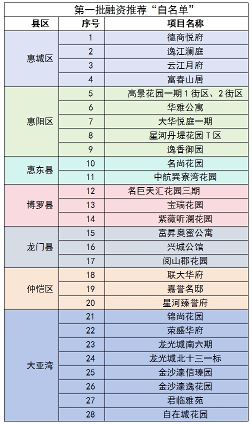 日前,第一批項(xiàng)目名單出爐了!28個(gè)房地產(chǎn)項(xiàng)目被列入融資推薦“白名單”,涵蓋惠州各縣區(qū),其中惠城區(qū)4個(gè),惠陽(yáng)區(qū)5個(gè),惠東縣2個(gè),博羅縣3個(gè),龍門縣3個(gè),仲愷高新區(qū)3個(gè),大亞灣開(kāi)發(fā)區(qū)8個(gè)。