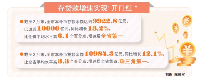 具體看,截至2月末,全市本外幣存款余額達(dá)到9922.8億元,已逼近10000億元,同比增長13.2%,比全省平均水平高6.1個百分點(diǎn),增速居全省第一;全市本外幣貸款余額10984.3億元,同比增長12.1%,比全省平均水平高3.3個百分點(diǎn),增速居全省第四、珠三角第一。