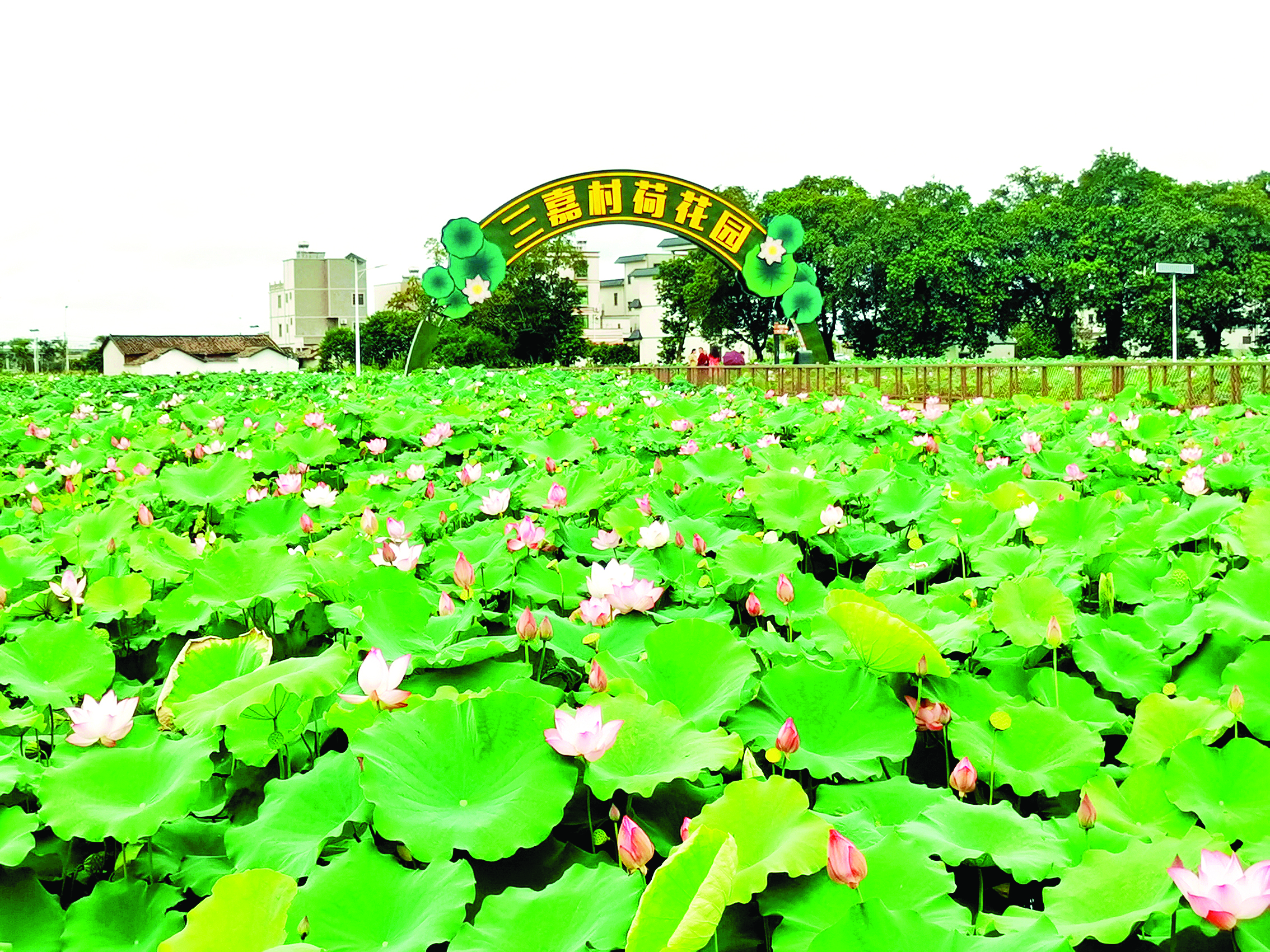 結(jié)合“百千萬(wàn)工程”典型村培育總體目標(biāo),三嘉村將“美麗庭院”建設(shè)與產(chǎn)業(yè)特色、風(fēng)土人文相融合,圍繞風(fēng)貌協(xié)調(diào),通過(guò)整治提升墻面路面、鄉(xiāng)村步道等,村容村貌煥然一新。以荷花美點(diǎn)綴庭院美,以荷花產(chǎn)業(yè)作為切入點(diǎn),采用“農(nóng)業(yè)+旅游”模式,持續(xù)開(kāi)拓具有特色的農(nóng)文旅新業(yè)態(tài),小小的蓮蓬不僅美化了村莊環(huán)境、扮靚了家園,也增加了村集體和村民的經(jīng)濟(jì)收入。