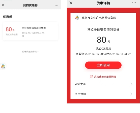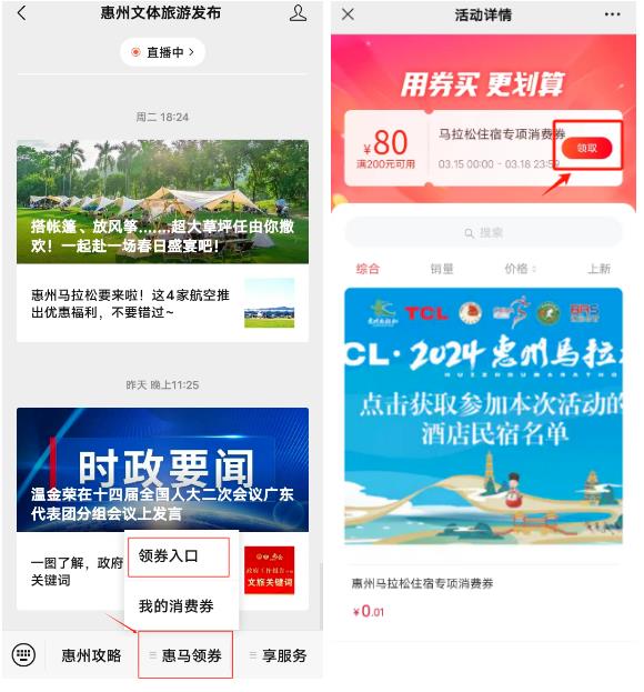 點(diǎn)擊“惠州文體旅游發(fā)布”公眾號底部菜單欄“惠馬領(lǐng)券”選擇“領(lǐng)券入口”,進(jìn)入活動頁面,使用中簽手機(jī)號碼授權(quán)登錄,點(diǎn)擊“領(lǐng)取”即可。