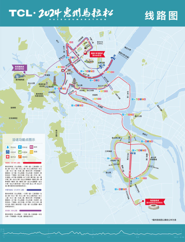 2.半程馬拉松(21.0975KM):云山西路(出發(fā)點)→文明一路→三新南路→文昌二路→東江一路→東江二路→東江三路(折返)→東江二路→東江一路→文昌二路→惠州大橋→環(huán)城西路→塘尾街→水門路→中山南路→中山東路→東新橋→新民后街→下塘街→濱江東路→東平路→東江大橋→惠州大道→菊花二路(折返)→文昌一路→云山西路→惠州體育館(終點)。