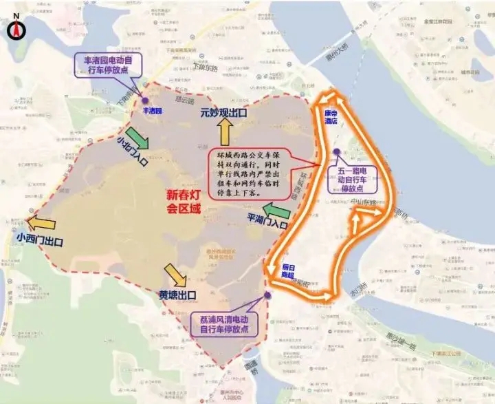 3、環(huán)城西路、塘尾街、水門路、環(huán)城東路、中山南路、中山東路、濱江西路及兩側人行道嚴禁停放各類車輛(含電動自行車等非機動車)。西湖周邊豐渚園停車場、五一路停車場、荔浦風清停車場作為電動自行車等非機動車專用停車場,禁止機動車進入停放。夜間燈會期間,陳公堤禁止車輛通行。