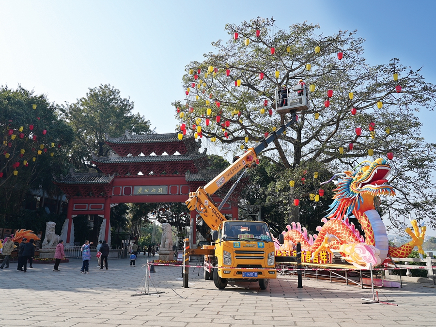 工作人員在惠州西湖景區(qū)平湖門加緊布置“祥龍賀歲”主題花燈。惠州日報記者哈鵬 攝