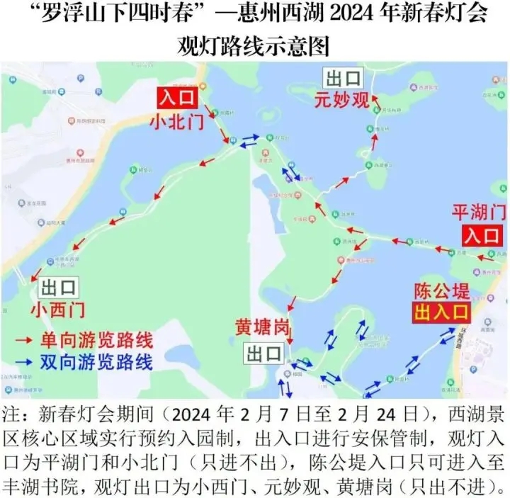 。ㄈ魰翢羝陂g出入口實行安保管制,觀燈入口為平湖門、小北門(只進不出),陳公堤入口只可進入至豐湖書院,觀燈出口為小西門、元妙觀、黃塘崗(只出不進),現(xiàn)場指揮部根據(jù)觀燈人流情況臨時管制。