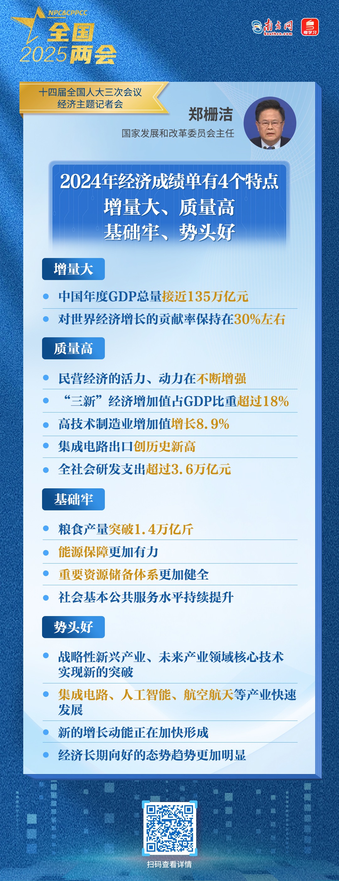 3月6日下午,十四屆全國人大三次會議舉行經(jīng)濟主題記者會。國家發(fā)展和改革委員會主任鄭柵潔在會上表示,過去一年中國經(jīng)濟展現(xiàn)了強大的韌性和活力,經(jīng)濟成績單有4個特點:增量大,質(zhì)量高,基礎(chǔ)牢,勢頭好。