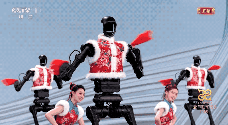 △在2025年總臺(tái)央視春晚上,宇樹(shù)科技的16個(gè)人形機(jī)器人與16名舞蹈演員協(xié)同共舞。