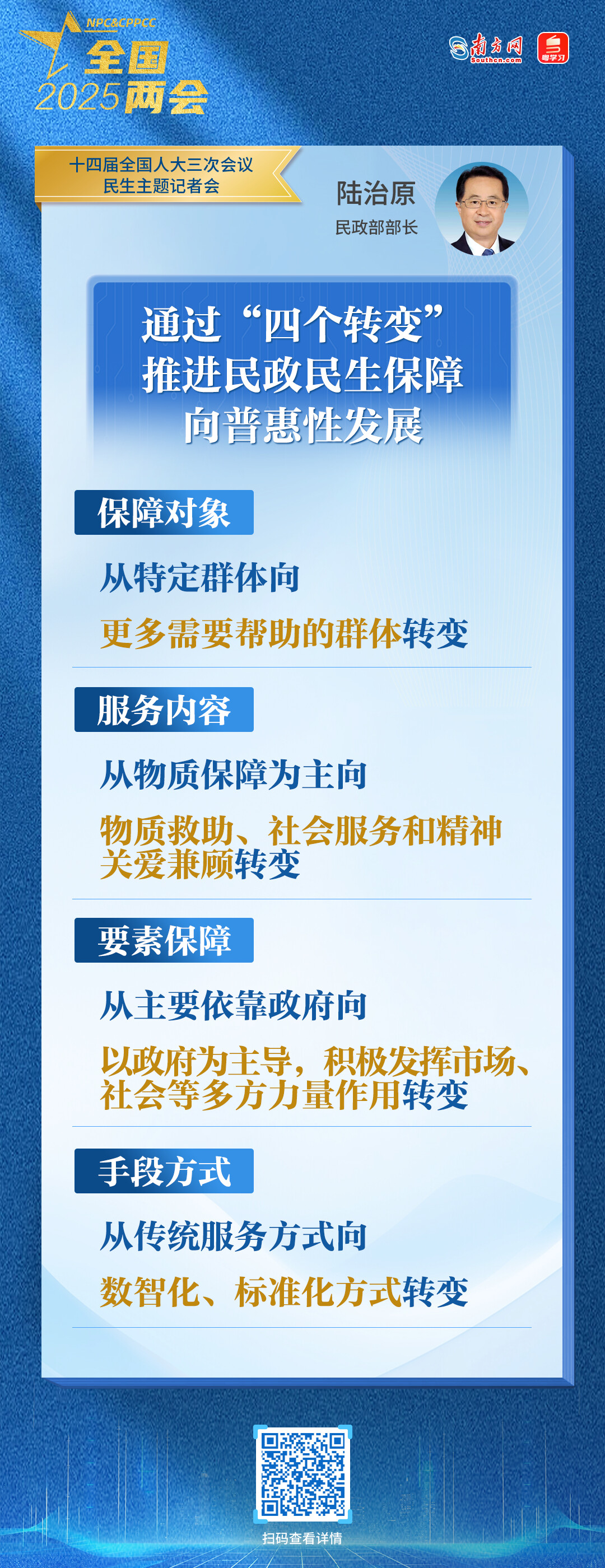 會上,民政部部長陸治原表示,民政工作要順應人民群眾的需求變化,逐步擴大相關民生保障政策覆蓋面,有序推進民政民生保障由兜底、基礎向普惠發(fā)展。概括講就是要推進“四個轉變”。