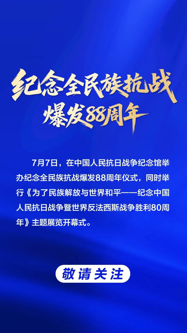 據(jù)“中國(guó)人民抗日戰(zhàn)爭(zhēng)紀(jì)念館”微信公眾號(hào)消息,7月7日,在中國(guó)人民抗日戰(zhàn)爭(zhēng)紀(jì)念館舉辦紀(jì)念全民族抗戰(zhàn)爆發(fā)88周年儀式,同時(shí)舉行《為了民族解放與世界和平——紀(jì)念中國(guó)人民抗日戰(zhàn)爭(zhēng)暨世界反法西斯戰(zhàn)爭(zhēng)勝利80周年》主題展覽開(kāi)幕式。