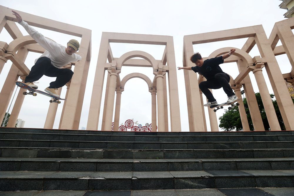 惠州市區(qū)下埔濱江公園,青少年滑板愛好者的雙人組合飛躍階梯;輬笕襟w記者楊建業(yè) 攝