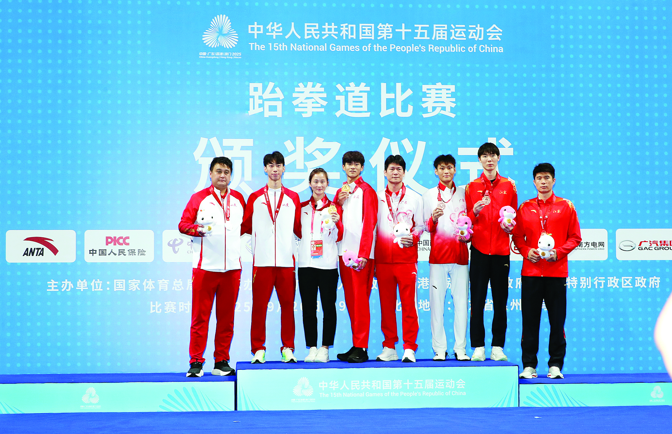 獲得跆拳道男子68公斤級前三名的選手和教練員上臺領(lǐng)獎。 惠州日報記者鐘暢新 攝