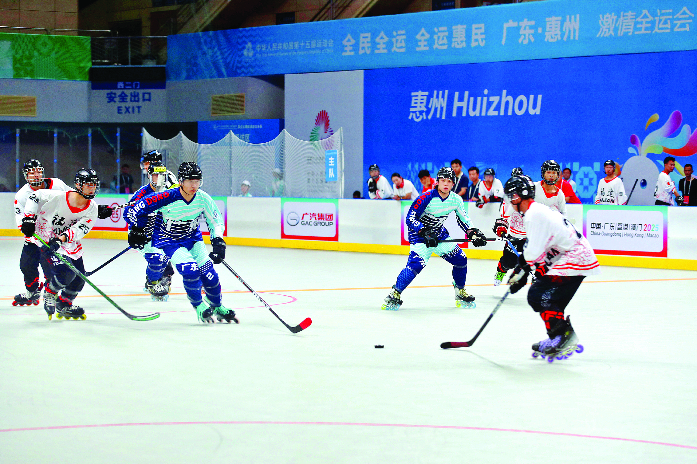 10月15日晚,第十五屆全運(yùn)會(huì)單排輪滑球項(xiàng)目決賽男子組小組賽,廣東隊(duì)(藍(lán)衣)13:1戰(zhàn)勝福建隊(duì)(白衣)。 惠州日?qǐng)?bào)記者鐘暢新 攝