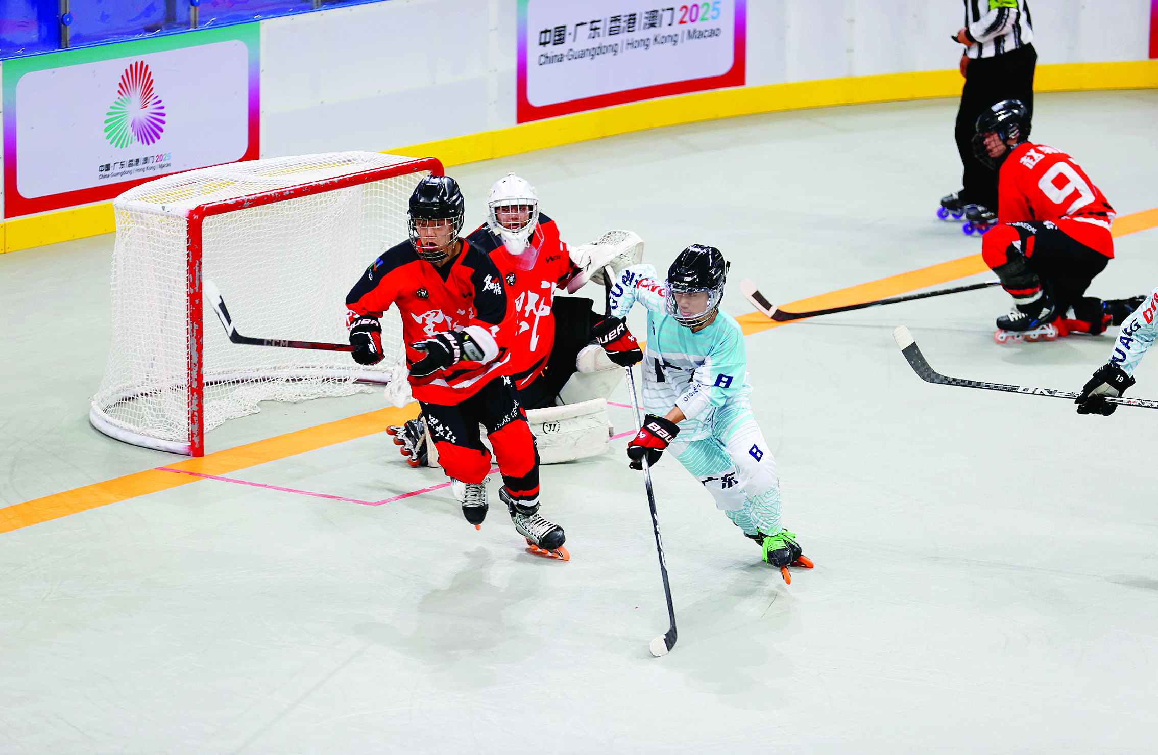 昨日的單排輪滑球比賽中,廣東男隊(藍方)4:1戰(zhàn)勝黑龍江男隊。惠州日報記者楊建業(yè) 攝