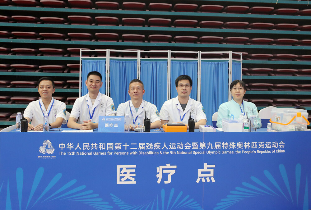 醫(yī)護人員為全國第十二屆殘疾人運動會暨第九屆特殊奧林匹克運動會大眾跳繩測試賽保駕護航。