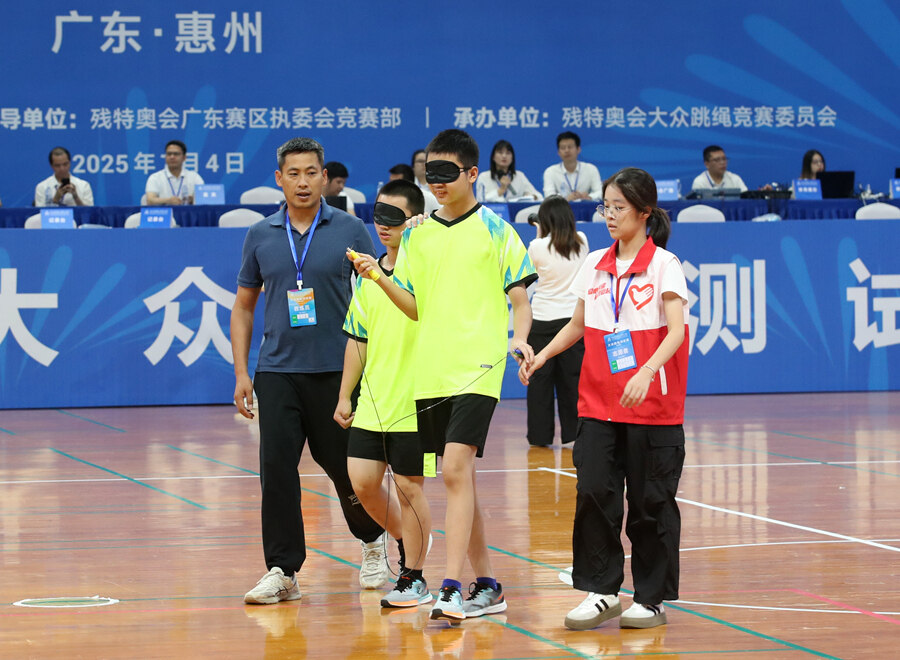 7月4日,惠州體育館內(nèi)繩影翻飛,掌聲如潮。全國第十二屆殘疾人運動會暨第九屆特殊奧林匹克運動會(以下簡稱“殘?zhí)貖W會”)大眾跳繩測試賽在這里火熱進行,來自廣州、中山、河源、揭陽四地的24名運動員以精湛的技藝和高昂的熱情,展現(xiàn)了殘疾人運動員的拼搏精神。