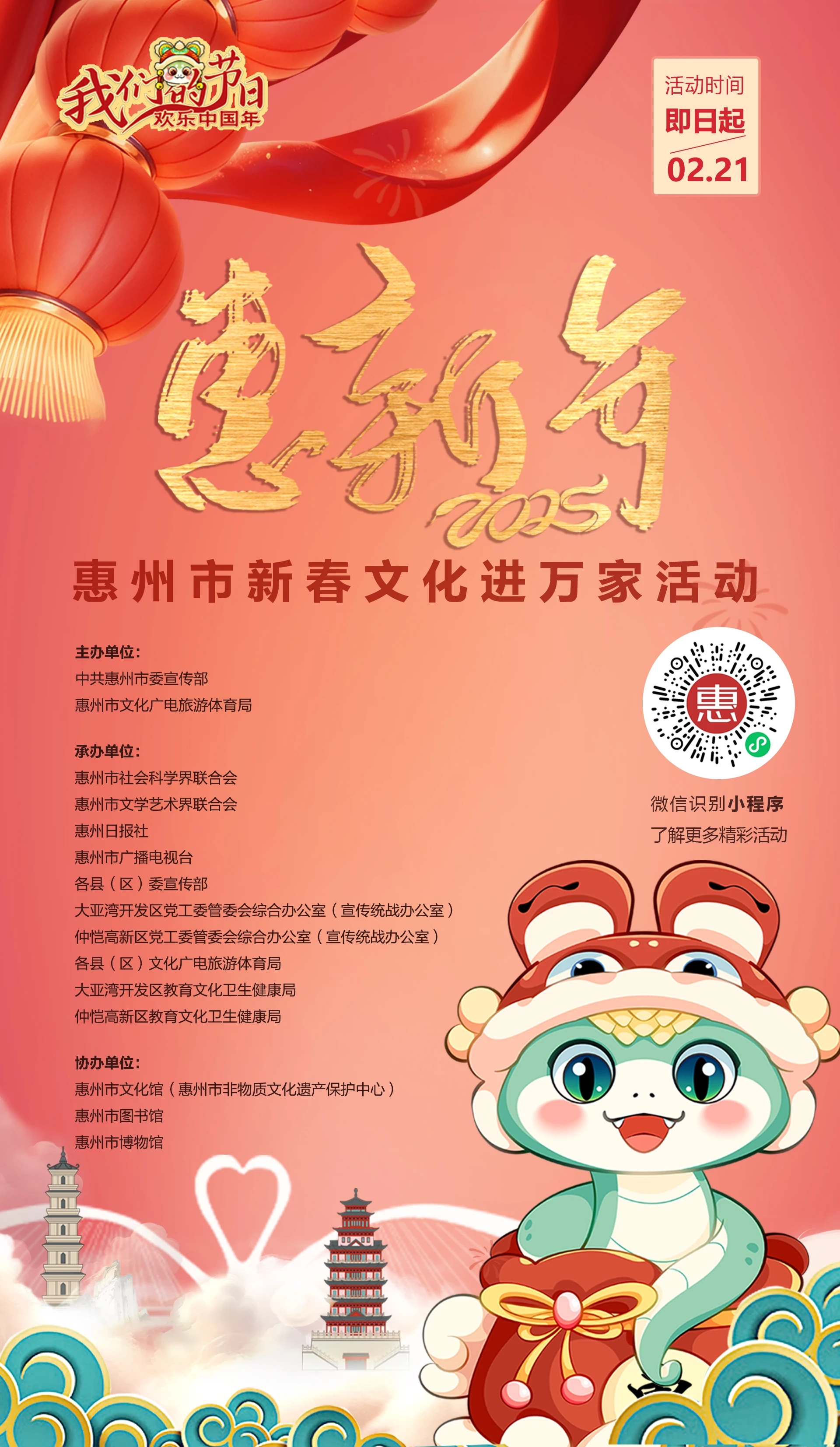 本次活動由中共惠州市委宣傳部、惠州市文化廣電旅游體育局主辦,旨在積極推動文化傳承發(fā)展和繁榮興盛,深入實施2025年“我們的中國夢——文化進(jìn)萬家”活動,以形式多樣的文化活動營造歡樂吉祥、溫暖和順的濃厚節(jié)日氛圍。