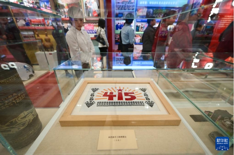 這是展覽上展示的納西族手工刺繡擺臺(tái)(4月15日攝)。新華社記者 李鑫 攝