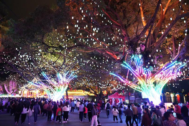 惠州西湖景區(qū)游人如織,或觀賞花燈,或拍照留念。本組圖片 惠州日?qǐng)?bào)記者朱金贊 鐘暢新 攝
