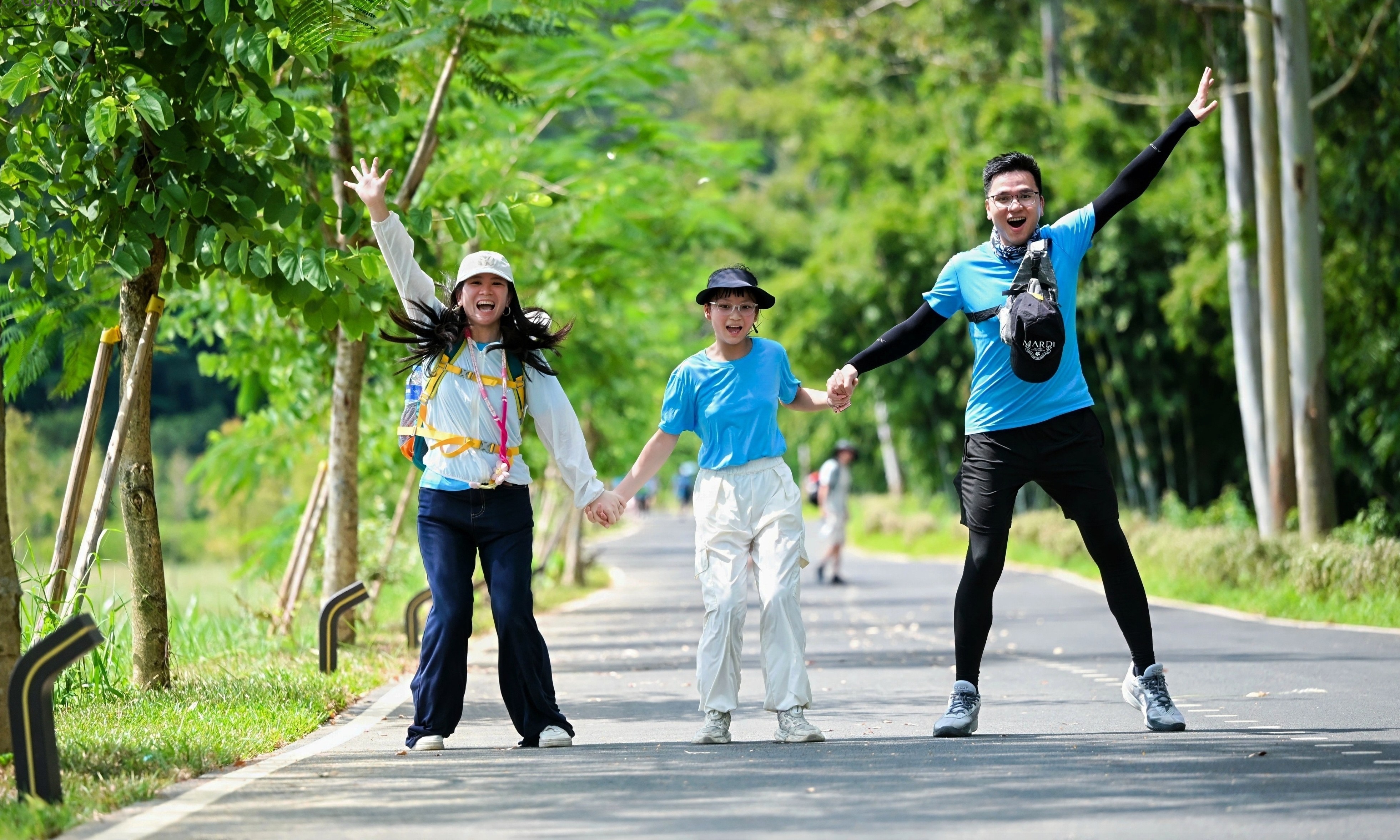 本次活動(dòng)依托218最美旅游公路的交通與景觀(guān)優(yōu)勢(shì),以羅浮山力天夢(mèng)幻樂(lè)園星光廣場(chǎng)為起點(diǎn),途經(jīng)風(fēng)袂驛、顯崗水庫(kù)驛站等地,最終抵達(dá)上良村,全程12.7公里,參與者沉浸式體驗(yàn)“人在畫(huà)中游”的詩(shī)意旅程!218最美旅游公路風(fēng)景特別美,之前自駕過(guò),這次徒步慢慢走,更能感受山水的秀美,沿途的驛站也建得很漂亮。”人群中,葉女士一家格外引人注目——三姐妹帶著6個(gè)孩子組成了“親子徒步團(tuán)”,對(duì)于沿途的風(fēng)景,她贊不絕口。