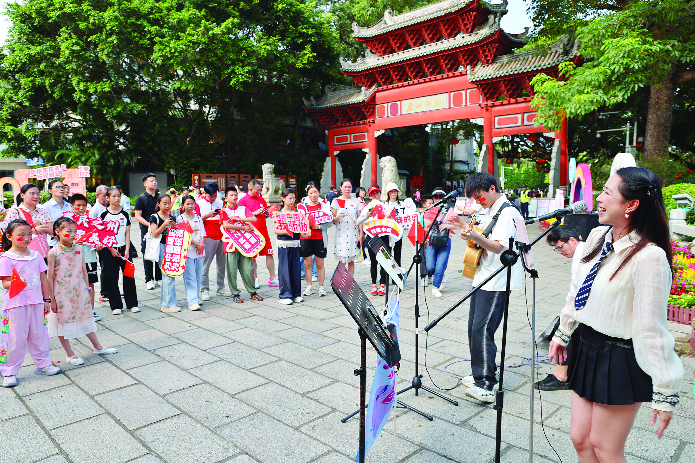 “我和我的祖國,一刻也不能分割,無論我走到哪里,都留下一首贊歌……”當(dāng)日上午9時,惠州西湖景區(qū)平湖門入口前,《我和我的祖國》歌曲響起,在悅耳的吉他聲中,大家伴著熟悉的旋律,高聲歌唱起來,共同祝福祖國繁榮昌盛。