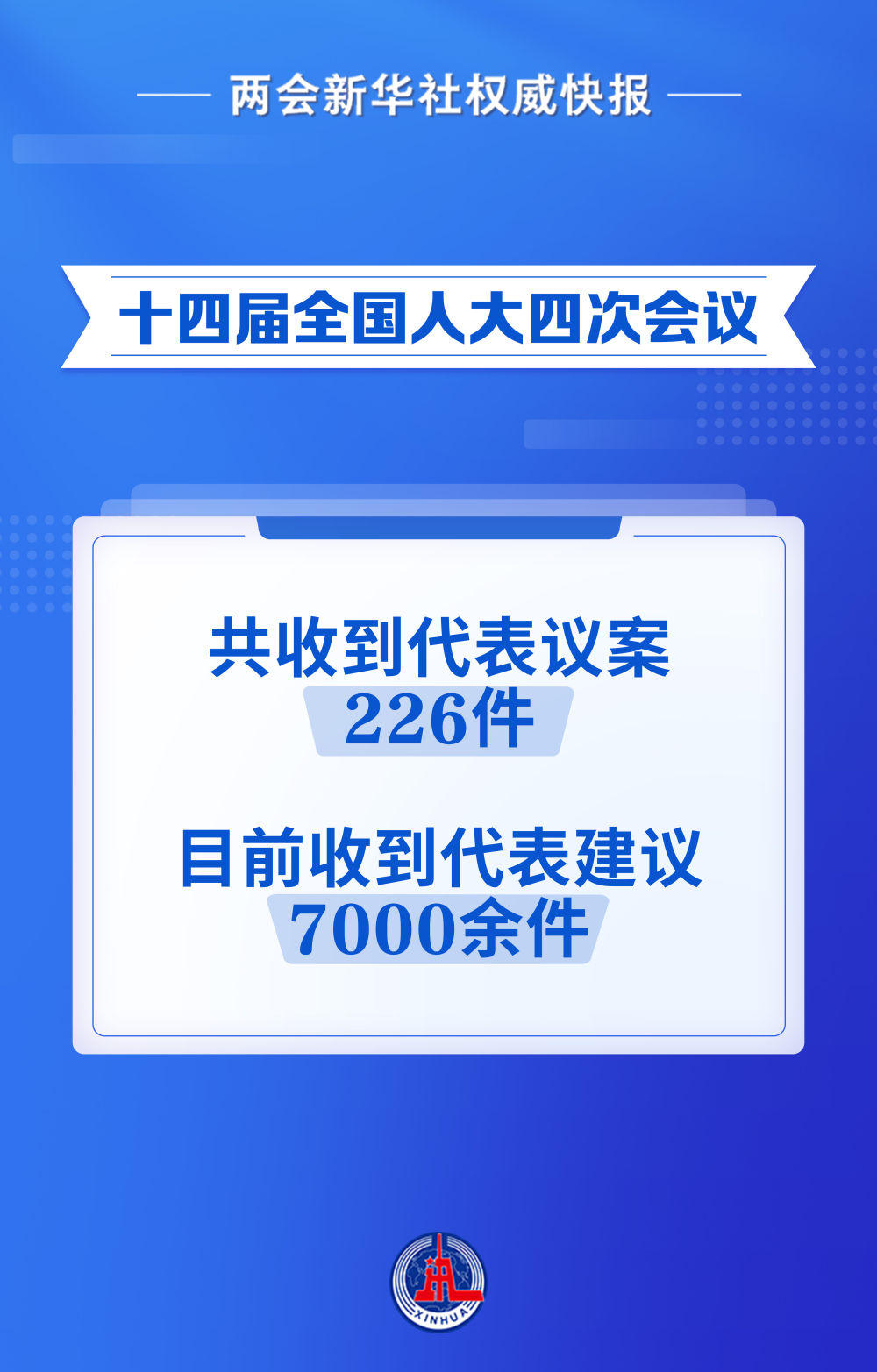 根據(jù)十四屆全國人大四次會議主席團決定的代表提出議案的截止時間,到3月8日12時,十四屆全國人大四次會議秘書處共收到代表議案226件。此外,目前大會秘書處已收到代表建議7000余件。