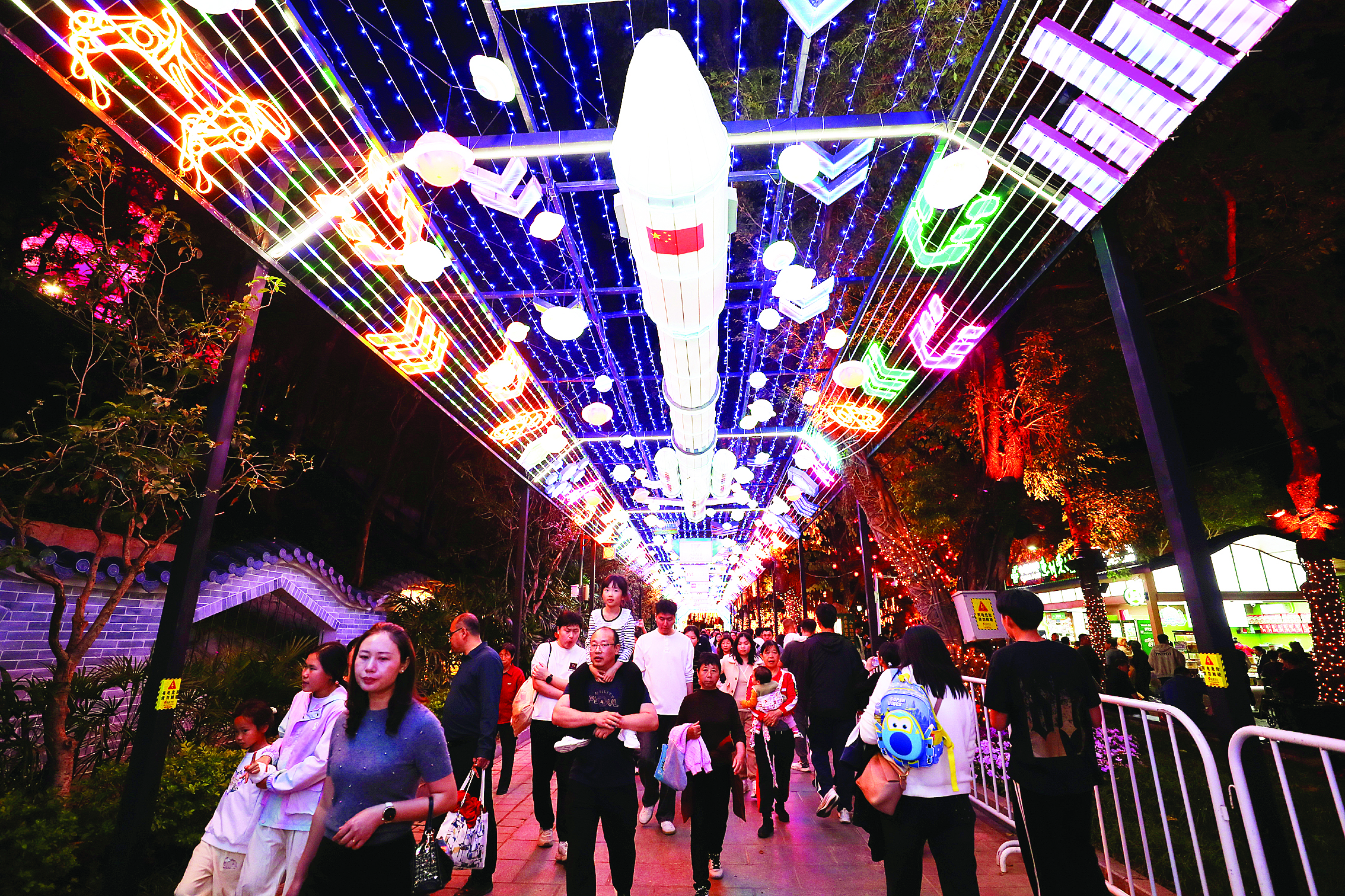 惠州西湖景區(qū)主入口處,市民游客在《馬到成功》燈組前拍照打卡。