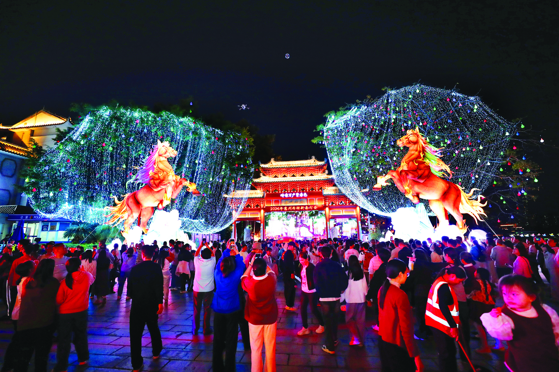 泗洲塔飛檐被暖光勾勒,蘇堤、芳華洲燈火次第綻放,星河般的光影倒映在湖面,微風(fēng)拂過,燈影隨水波搖曳,氛圍感拉滿。蘇堤上人山人海,孩童牽著家長的手追逐流動的燈影,年輕人舉著手機(jī)拍攝定格美景,大家在璀璨光影中感受惠州馬年新春的暖意。