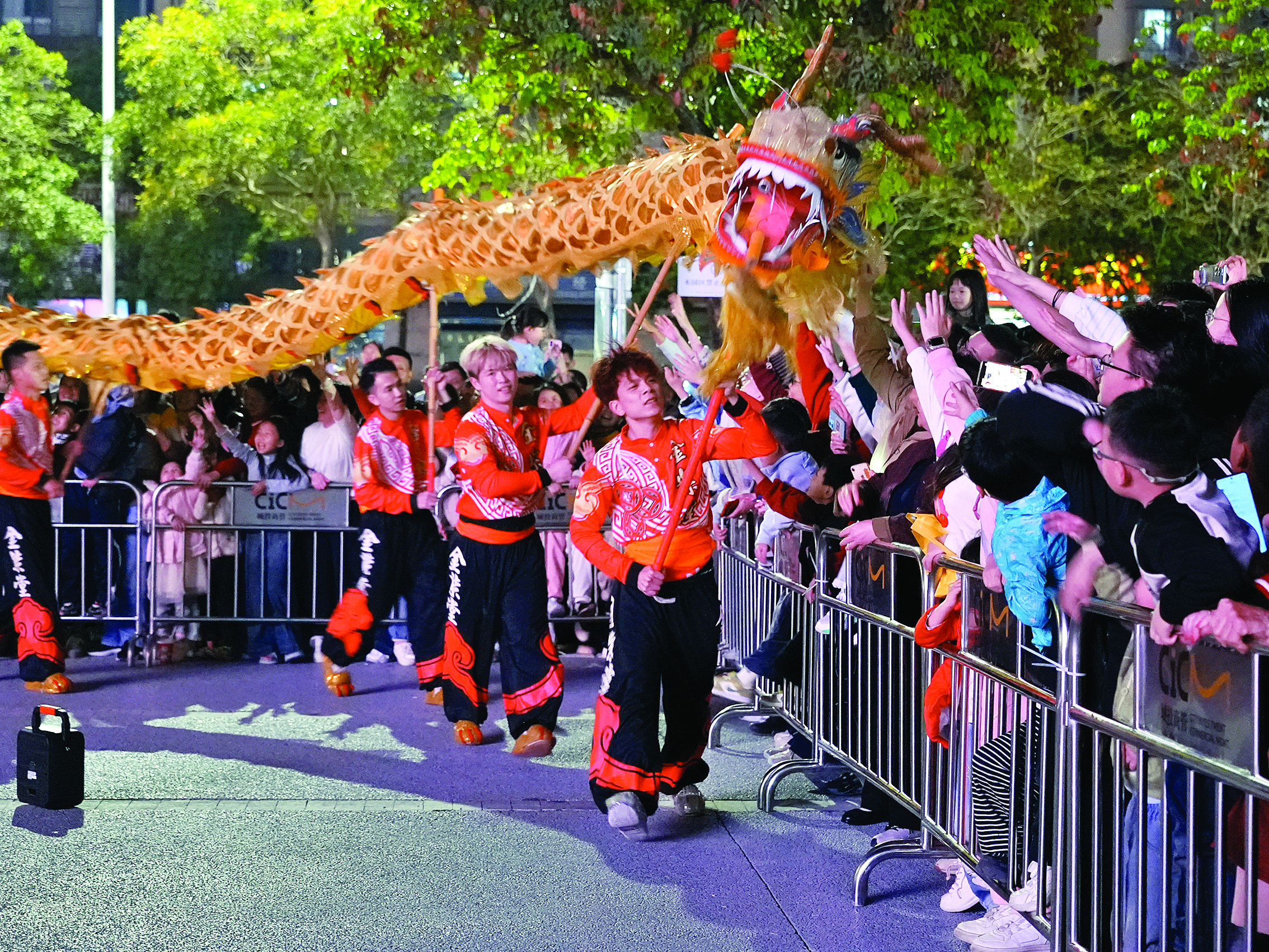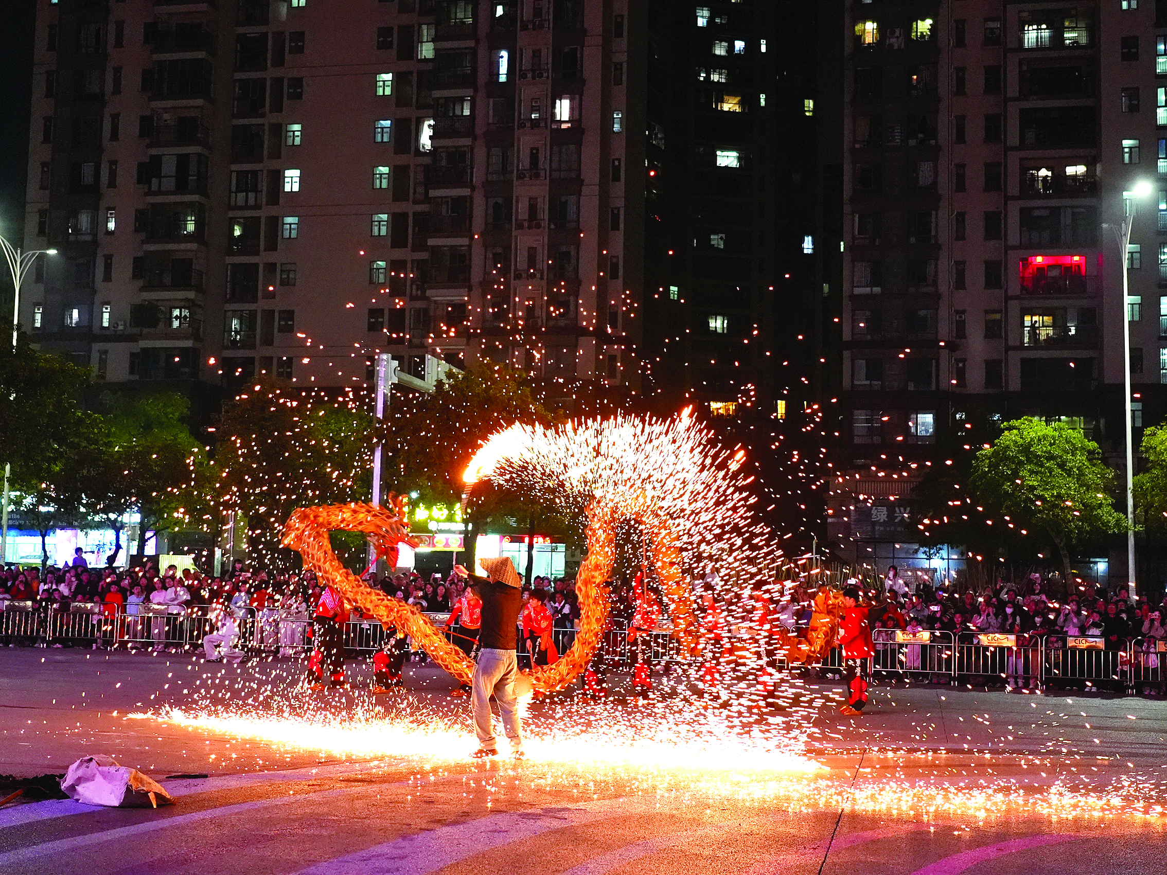 緊接著,游龍伴舞、火龍表演、非遺火壺秀輪番上演,藝人手持火壺輾轉(zhuǎn)騰挪,火焰在空中劃出靈動(dòng)弧線;點(diǎn)燃全場熱情的游龍?jiān)诨鸸庵写┧篁v躍,鑼鼓聲與歡呼聲交織,年味與氛圍感頓時(shí)拉滿。