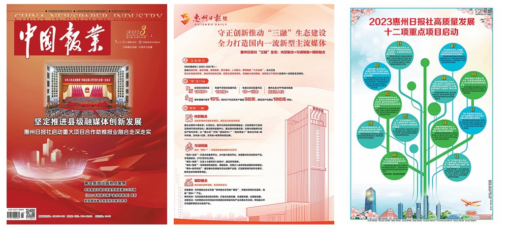 《中國報業(yè)》雜志是中宣部新聞出版主管部門認定的學術期刊,是中國報業(yè)協(xié)會主管主辦的國內首家傳媒經濟導刊。該雜志為半月刊,3月(上)這一期雜志封面上,以“惠州日報社啟動重大項目合作助推報業(yè)融合走深走實”作為導讀,直接讓惠州日報社在報業(yè)行業(yè)“出圈”。循著導讀翻開雜志,封二可以看到惠州日報社推進“三融”生態(tài)建設的目標、路徑及其主要內涵,P1則介紹了2023惠州日報社高質量發(fā)展12項重點項目的主要內容。在P2和P3的“本刊特稿”欄目中,以《搭建交流平臺 匯聚媒體智慧——惠州日報社啟動重大項目合作助推報業(yè)融合走深走實》為題,用“通版+圖文”報道的形式,介紹了惠州日報社推進“三融”生態(tài)建設、打造新型主流媒體的亮點舉措,以及與中國報業(yè)協(xié)會中國報業(yè)雜志社合作共建“中國報業(yè)媒體融合示范基地”的目的和意義等。