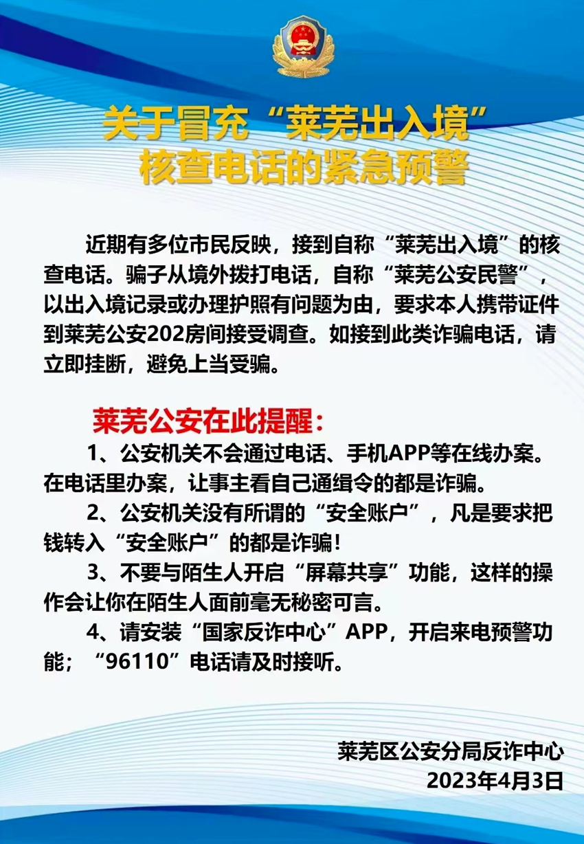 冒充“萊蕪出入境”核查電話的緊急預(yù)警