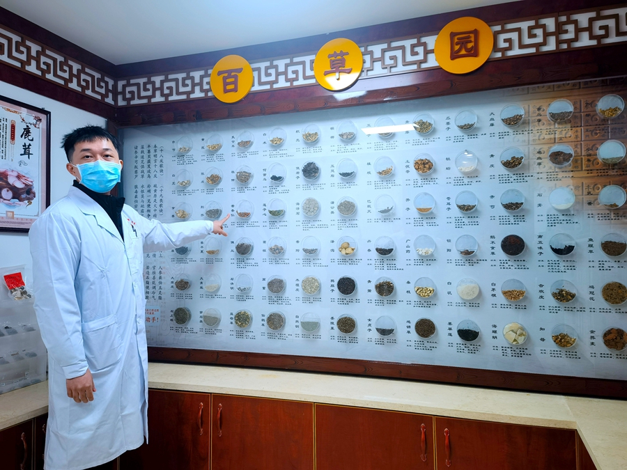 鎮(zhèn)隆鎮(zhèn)衛(wèi)生院中醫(yī)館內(nèi)陳列著各種中藥材。