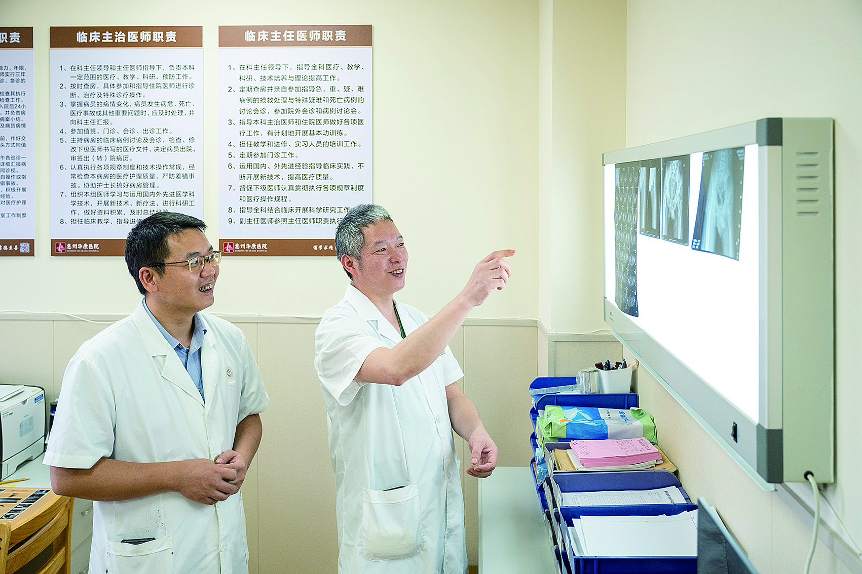 華康醫(yī)院骨傷關(guān)節(jié)創(chuàng)傷科主任周武忠(右一)查看患者恢復(fù)情況。