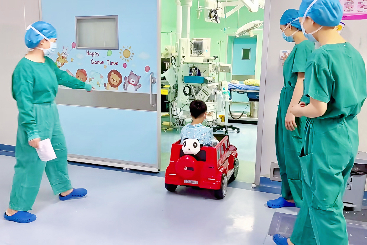 就醫(yī)需要安靜的環(huán)境,由于婦幼保健院的特殊性,少不了出現(xiàn)兒童的哭喊聲,孩子做手術哭鬧也大大增加了家長的擔憂。為此,市第一婦幼保健院打造“兒童無哭聲手術室”,讓患者可以在手術室等候區(qū)的游戲區(qū)玩耍,甚至可以開著兒童電動車從術前準備區(qū)進入手術室。這些暖心的小舉措,給患兒足夠的術前心理緩沖時間,能有效緩解患兒術前緊張焦慮情緒,保證患兒安全、舒適,讓手術變得更有溫度。
