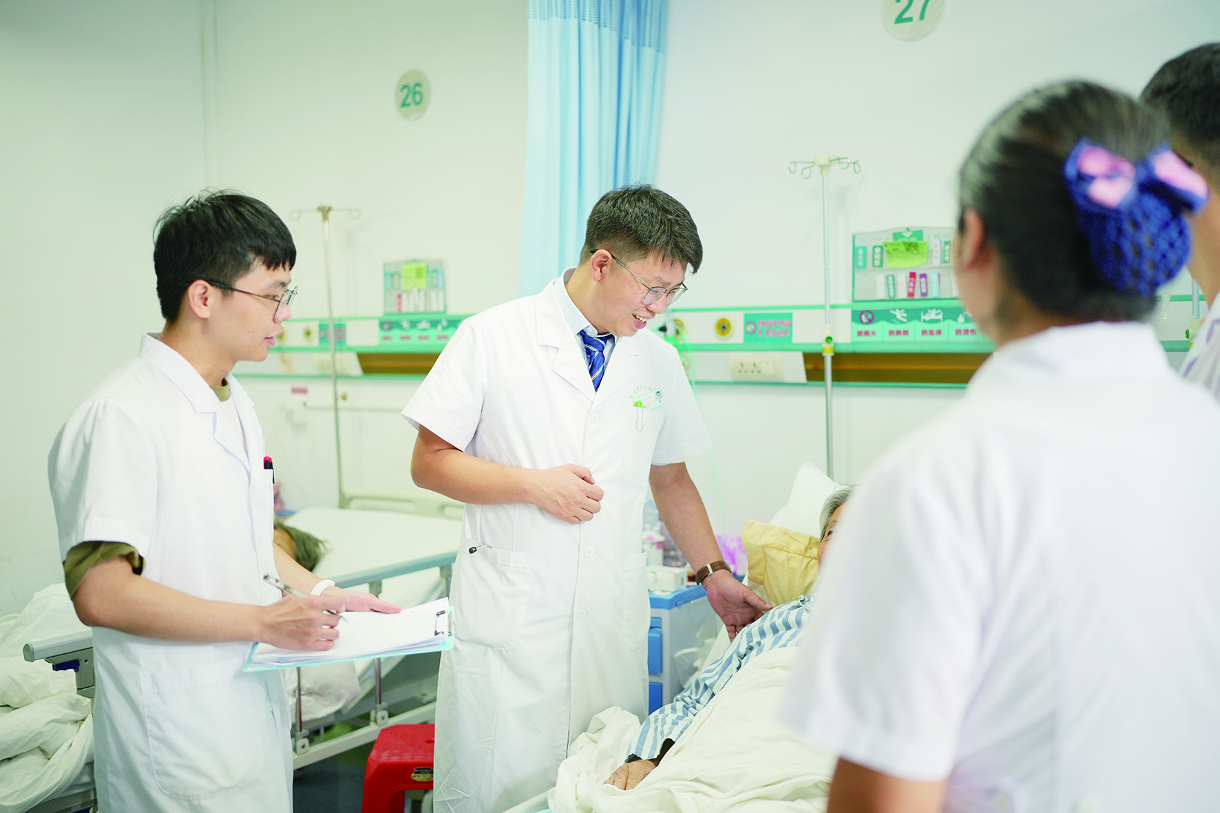 夏喜剛(中)帶領(lǐng)醫(yī)護(hù)團(tuán)隊(duì)查房。 本版圖片惠州日?qǐng)?bào)記者周楠 攝