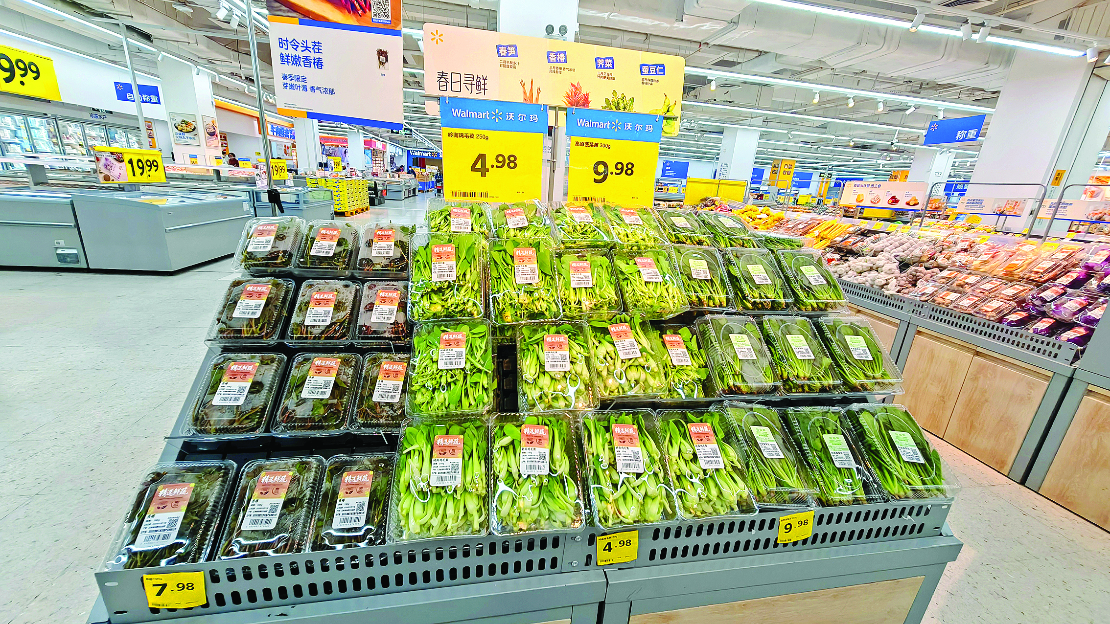 沃爾瑪超市專門設(shè)置的春菜區(qū)域擺放著春筍、香椿、薺菜等時(shí)令鮮蔬。