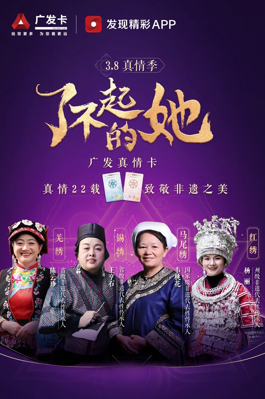 廣發(fā)真情卡攜手“天才媽媽”,將馬尾繡、羌繡、紅繡、錫繡四種非遺技藝傳承人的故事帶入到大眾視野,通過故事、人物、作品傳遞非遺文化的意蘊,呈現(xiàn)她們身上傳承、熱愛、自信、堅持等珍貴的品質(zhì),展現(xiàn)女性力量。一支“了不起的她”紀(jì)錄片走進非遺傳承人的生活環(huán)境,用鏡頭記錄、細致地展現(xiàn)出馬尾繡、羌繡、紅繡、錫繡非遺傳承人的真實故事、技藝及背后蘊含的民族文化,經(jīng)由韋桃花、陳云珍、王亨石、楊麗、潘正永五位傳承人娓娓道來的講述,真情致敬非遺之美,致敬每一位“了不起”的她。