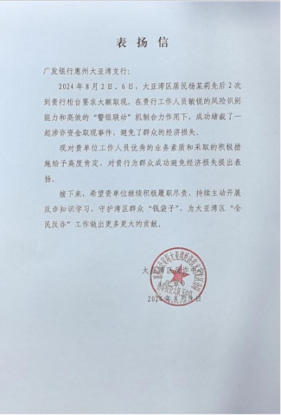 惠州市大亞灣區(qū)反詐中心近日向廣發(fā)銀行惠州大亞灣支行發(fā)出表?yè)P(yáng)信,以表彰支行在近期成功防范一起涉詐資金取現(xiàn)事件中的出色表現(xiàn)。