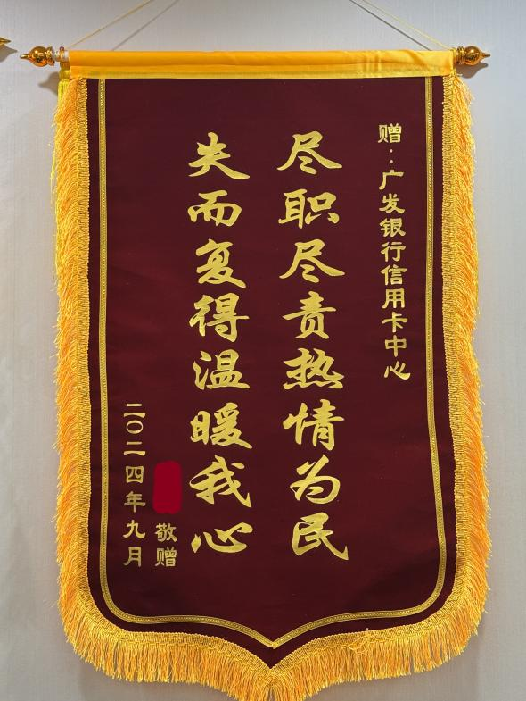 去年7月,湖南衡陽曾女士不慎陷入了一場以“投資理財”為名的電信詐騙陷阱,被騙走資金高達上百萬元。在廣發(fā)信用卡中心與衡陽警方的共同努力下,部分被騙資金得以追回,為曾女士挽回了一部分損失。為了表達對廣發(fā)信用卡中心的感激之情,曾女士特意制作了一面錦旗贈予廣發(fā)卡中心。