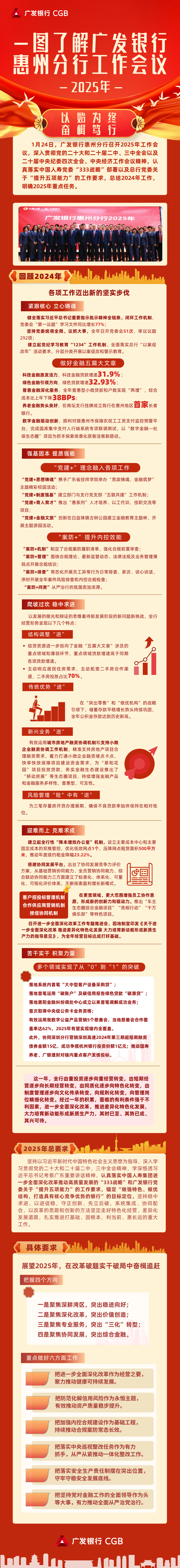 1月24日,廣發(fā)銀行惠州分行召開(kāi)2025年工作會(huì)議。會(huì)議深入貫徹黨的二十大和二十屆二中、三中全會(huì)以及二十屆中央紀(jì)委四次全會(huì)、中央經(jīng)濟(jì)工作會(huì)議精神,認(rèn)真落實(shí)中國(guó)人壽集團(tuán)進(jìn)一步全面深化改革推動(dòng)高質(zhì)量發(fā)展的“333戰(zhàn)略”和廣發(fā)銀行黨委關(guān)于“提升五項(xiàng)能力”的工作要求,總結(jié)2024年工作,明確2025年重點(diǎn)任務(wù)。