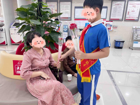 活動(dòng)當(dāng)天,兩位小志愿者在銀行工作人員的帶領(lǐng)下,帶上專屬的綬帶,正式“上崗”。從認(rèn)識(shí)銀行大廳的智能設(shè)備、學(xué)習(xí)引導(dǎo)客戶取號(hào),到協(xié)助整理宣傳資料、為等候區(qū)的客戶遞送飲用水,用認(rèn)真的態(tài)度和稚嫩的行動(dòng)詮釋著“志愿者”的擔(dān)當(dāng)。孩子們捧著支行準(zhǔn)備的康乃馨,走向大廳內(nèi)的女性客戶:“阿姨,母親節(jié)快樂!這朵花送給您!”柔軟的童聲搭配鮮艷的花束,讓等候區(qū)瞬間洋溢著溫馨。最讓他們興奮的是“金融知識(shí)小課堂”環(huán)節(jié),工作人員通過互動(dòng)問答,深入淺出地講解了人民幣識(shí)別、安全用卡等知識(shí),孩子們積極舉手提問,現(xiàn)場(chǎng)氣氛熱烈。